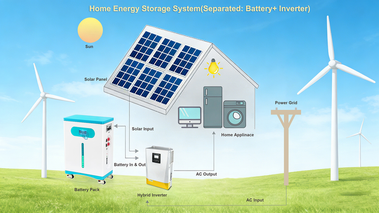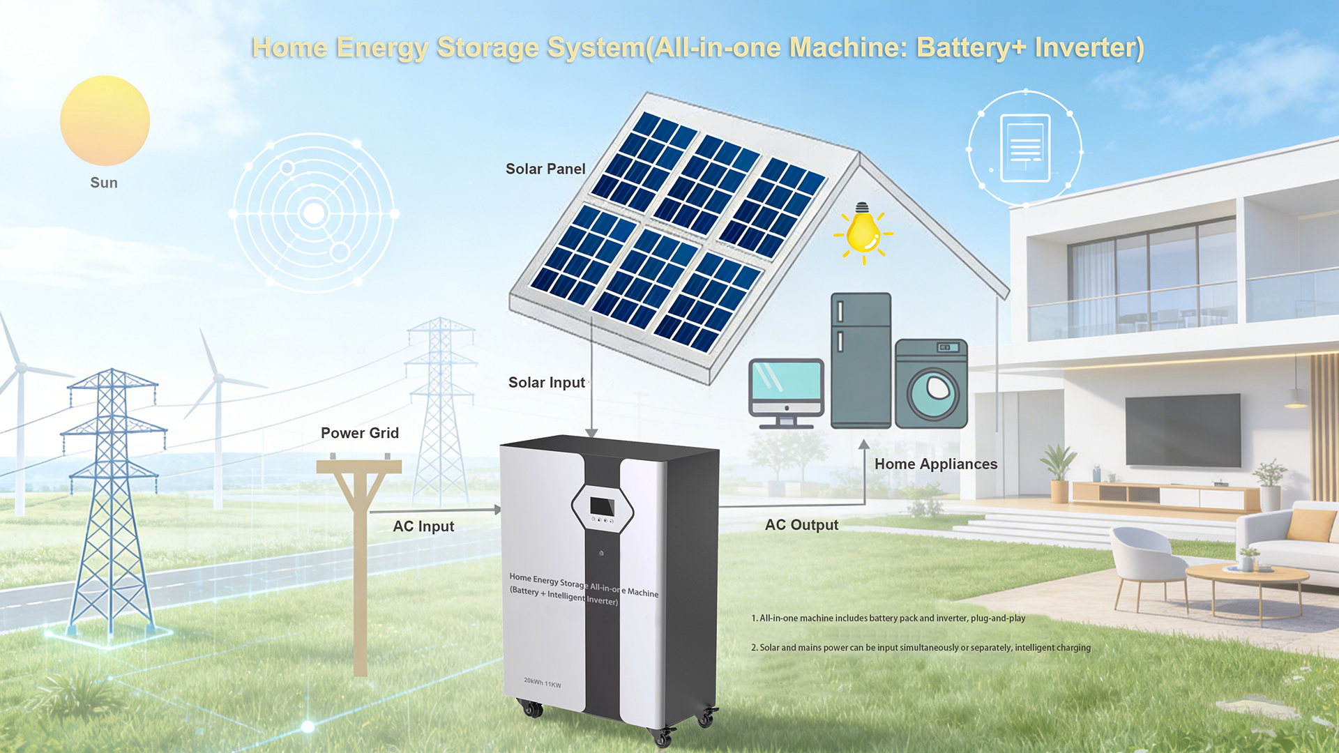 A sleek, integrated unit combining 5kW/6kW Hybrid Inverter + 5-10kWh LiFePO4 battery.